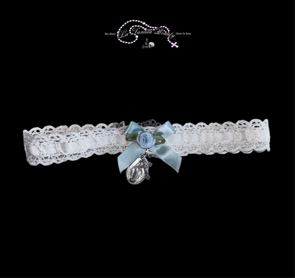 Crafted from white cotton lace and satin ribbon, it features a sky-blue bow and miraculous medal centerpiece.